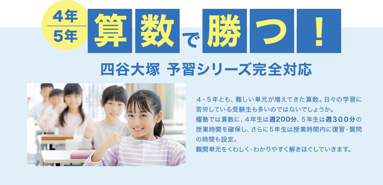 4・5年とも、難しい単元が増えてきた算数。日々の学習に苦労している受験生も多いのではないでしょうか。櫂塾では算数に、4年生は週200分、5年生は週300分の授業時間を確保し、さらに5年生は授業時間内に復習・質問の時間も設定。難関単元をくわしく・わかりやすく解きほぐしていきます。