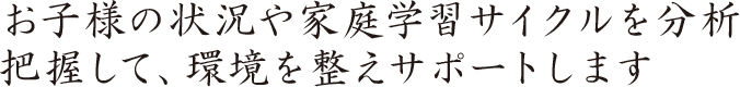 一人ひとり得意科目も苦手科目も、進みたい進路も行きたい学校も変わってきます。当塾は少人数の強みを生かし。一人ひとりきちんとヒヤリングをし、有名校だけではなく行きたい中学に合わせ、個別で課題や学習進歩状況を把握します。得意な教科はもちろん、苦手な教科をも好きに導き、楽しく学ぶ学習環境を作ることで、まだ見ぬ可能性も引く出します。